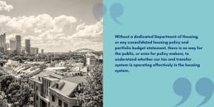 Without a dedicated Department of Housing, or any consolidated housing policy and portfolio budget statement, there is no way for the public, or even for policy makers, to understand whether our tax and transfer system is operating effectively in the housing system.